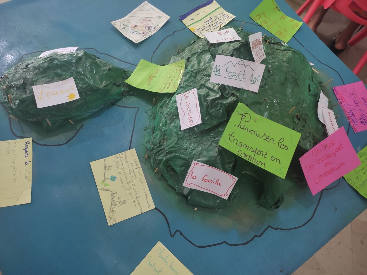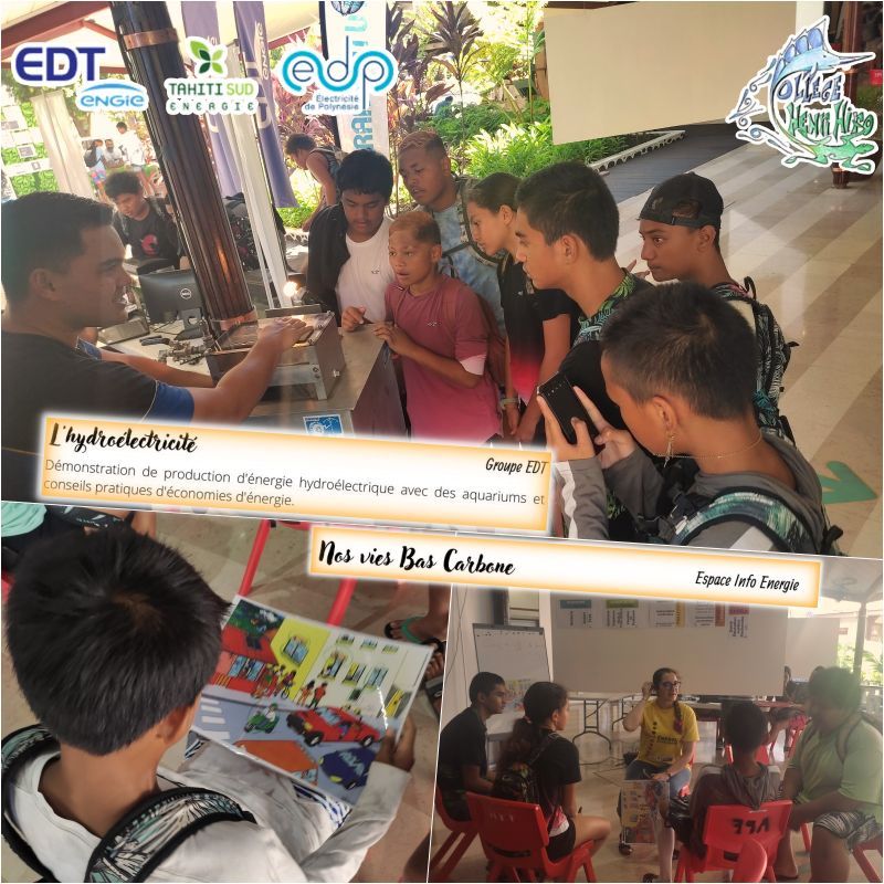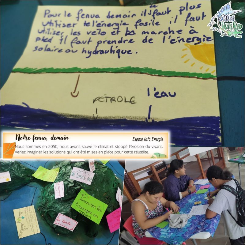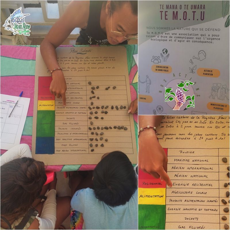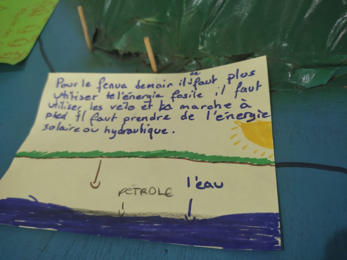 Atelier "sobriété numérique", atelier "nos vies bas carbone" avec une participation active des élèves, atelier "Notre fenua, demain" où des solutions sont proposées par les élèves : utiliser le vélo, limiter les énergies fossiles, exploiter les énergies renouvelables.