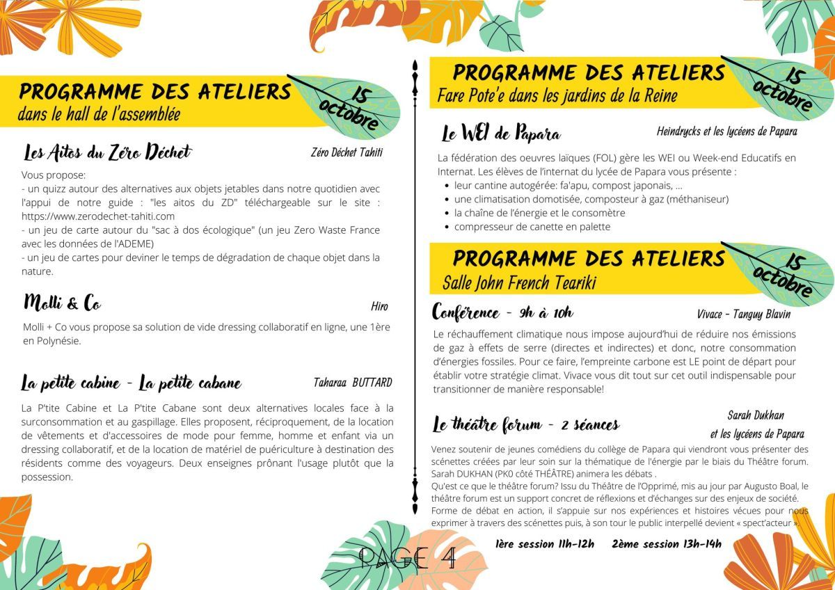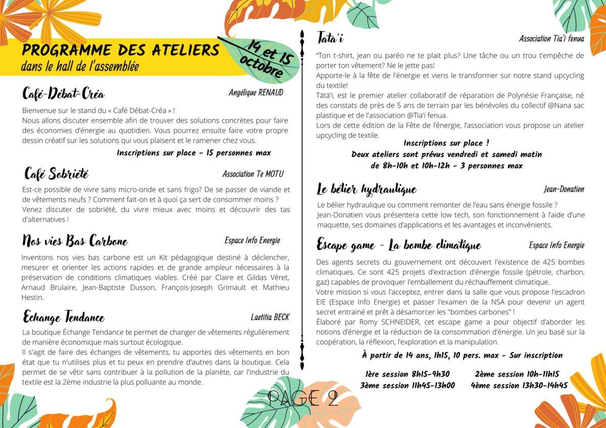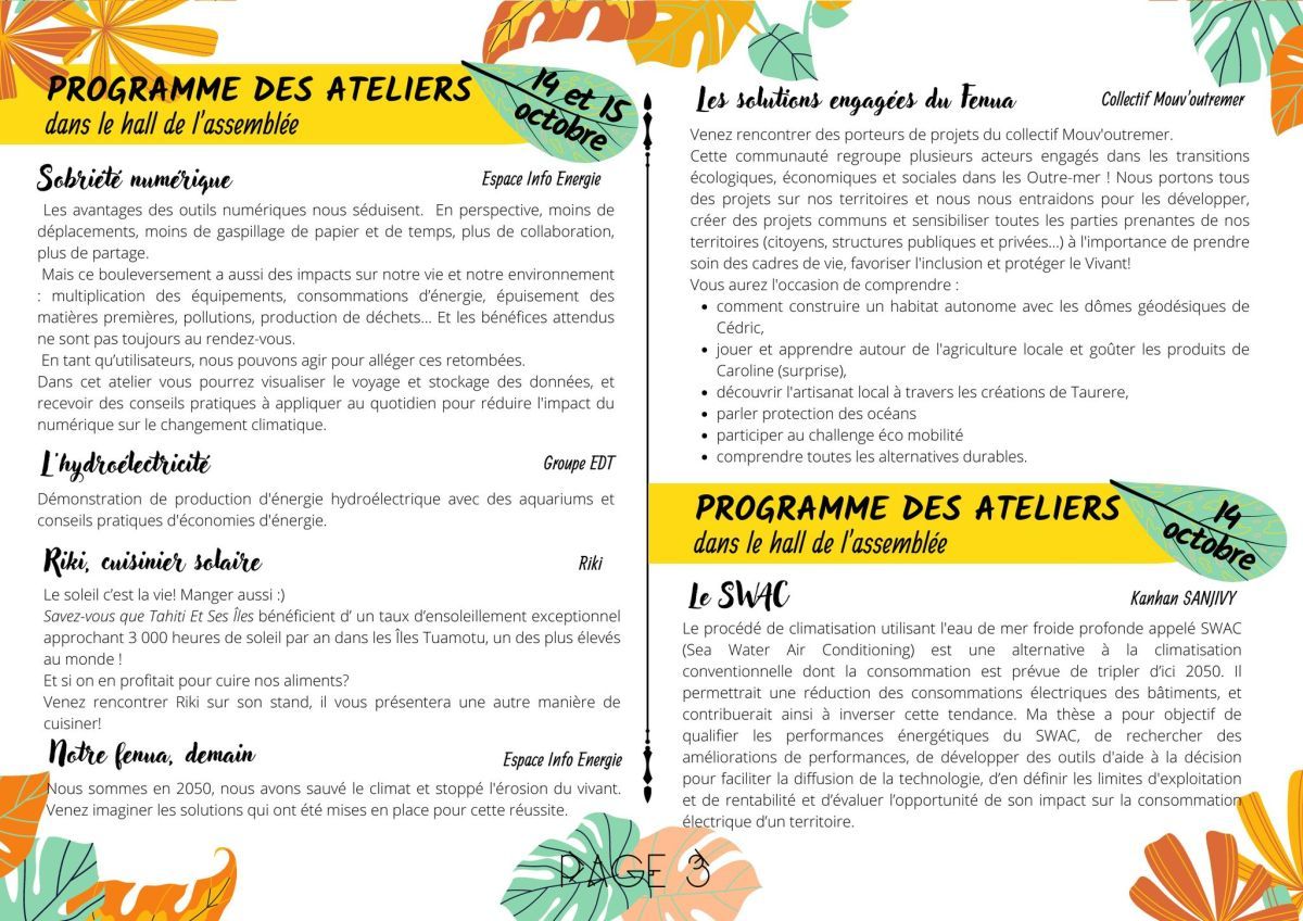 Atelier "sobriété numérique", atelier "nos vies bas carbone" avec une participation active des élèves, atelier "Notre fenua, demain" où des solutions sont proposées par les élèves : utiliser le vélo, limiter les énergies fossiles, exploiter les énergies renouvelables.