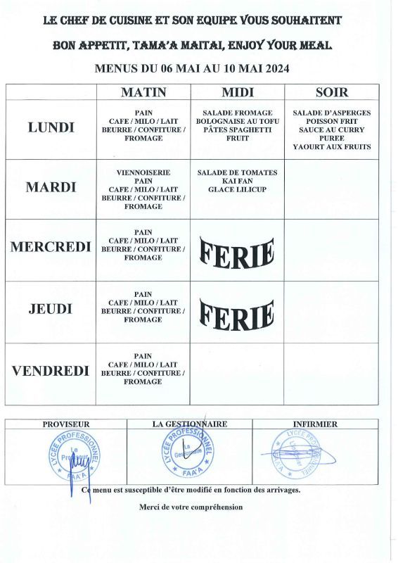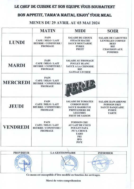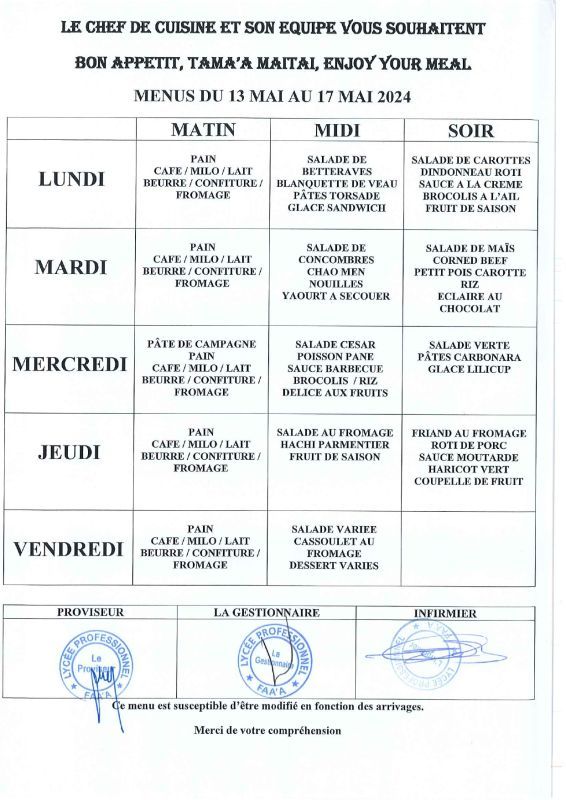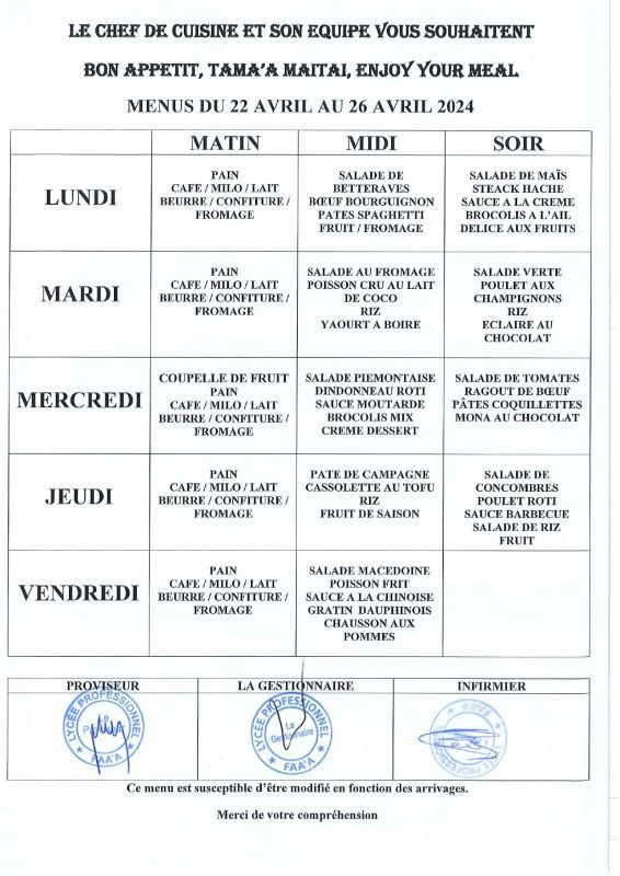 Menus du 15 avril au 17 mai 2024