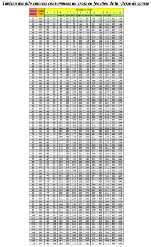 - tableau des calories consommées en fonction de la vitesse de course