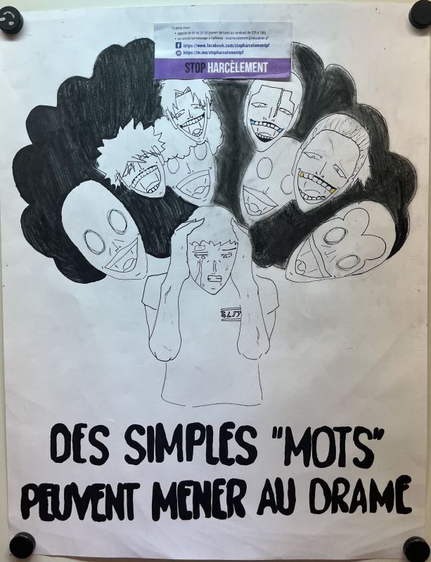 Mme Nicolas, professeure d’histoire-géographie-EMC, a sensibilisé les élèves à travers le Serious Game “Stop à la violence”. Puis, Mme Mathieu, professeure de français, les a accompagnés dans la création de leur slogan qu’ils ont ensuite matérialisé par une affiche, réalisée en arts plastiques avec M.Allegret. Enfin, Mme Tognet a encadré 10 élèves volontaires de la classe afin de les aider à préparer leur prestation à l’oral. Ces élèves ont transmis leurs connaissances auprès des six classes de 5ème, soit 122 élèves auxquels ils ont présenté leurs affiches en expliquant le slogan et le visuel choisis avant d’échanger avec eux au sujet du harcèlement.