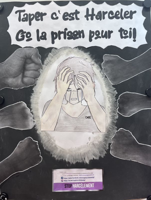 Nous félicitons les élèves de la 3D pour la réalisation de leurs affiches qui allient qualité et créativité et pour leur intervention auprès des plus jeunes afin de faire passer un message fort : « Vivre ensemble, c’est refuser le harcèlement ».