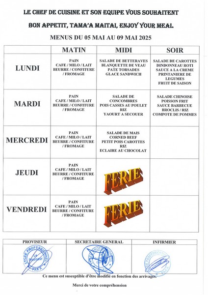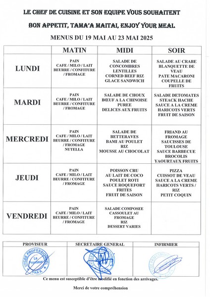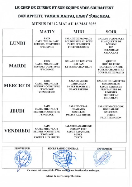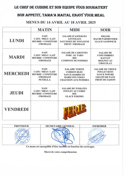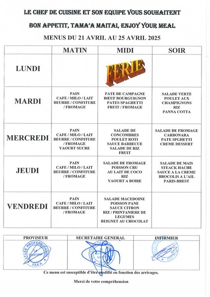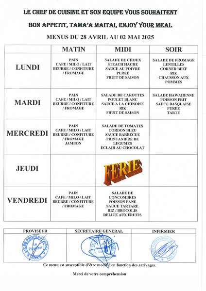 Menus du 14 avril au 23 mai 2025